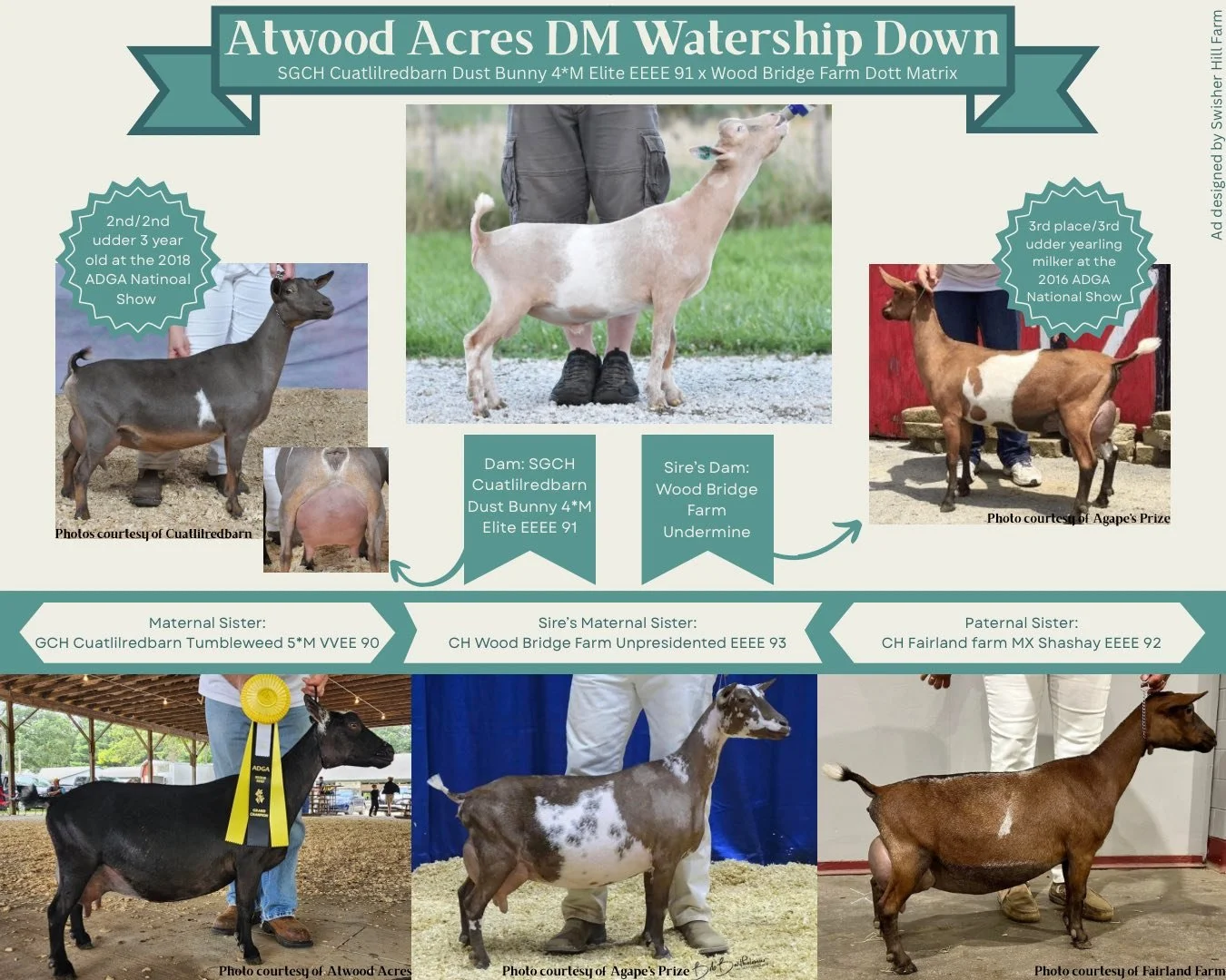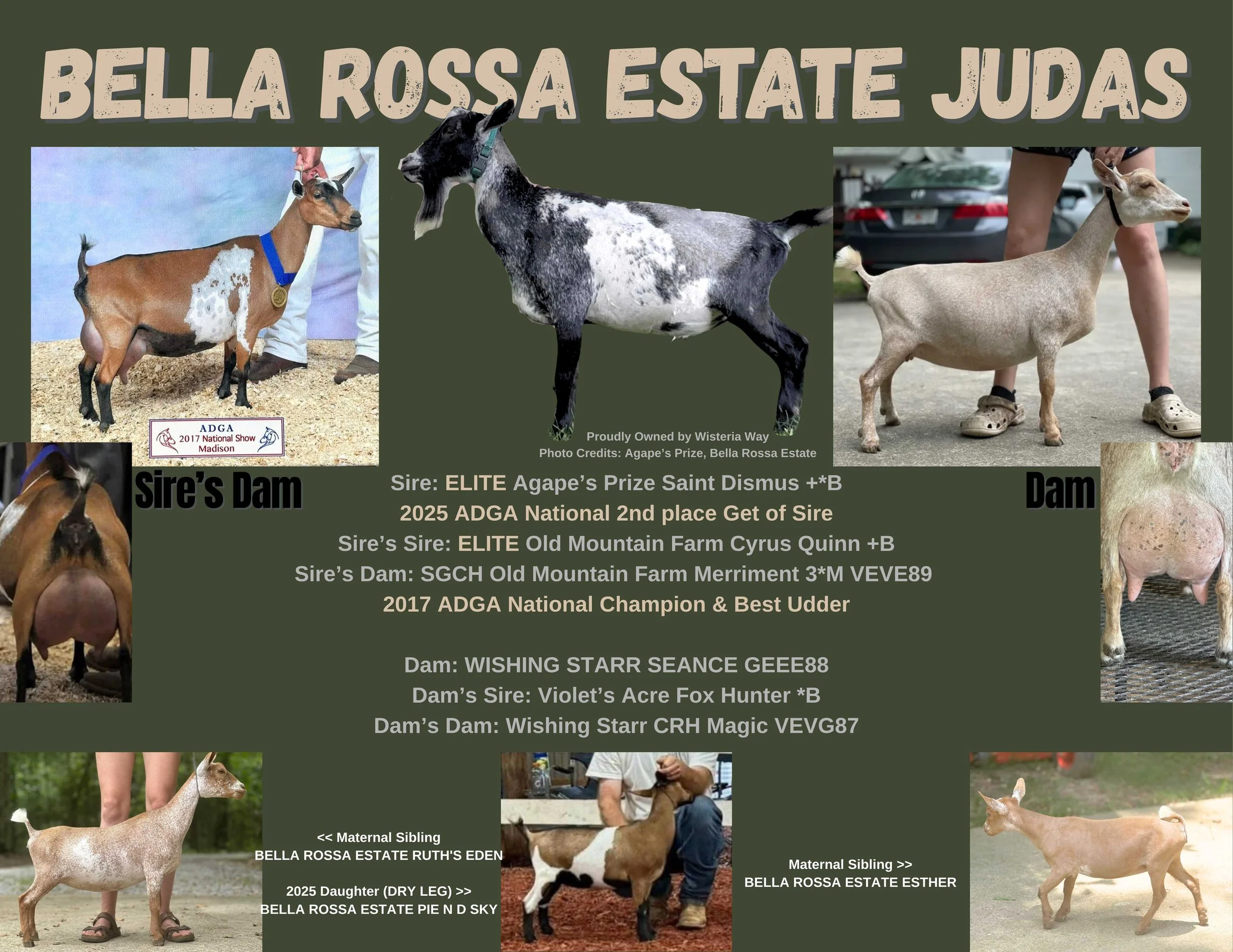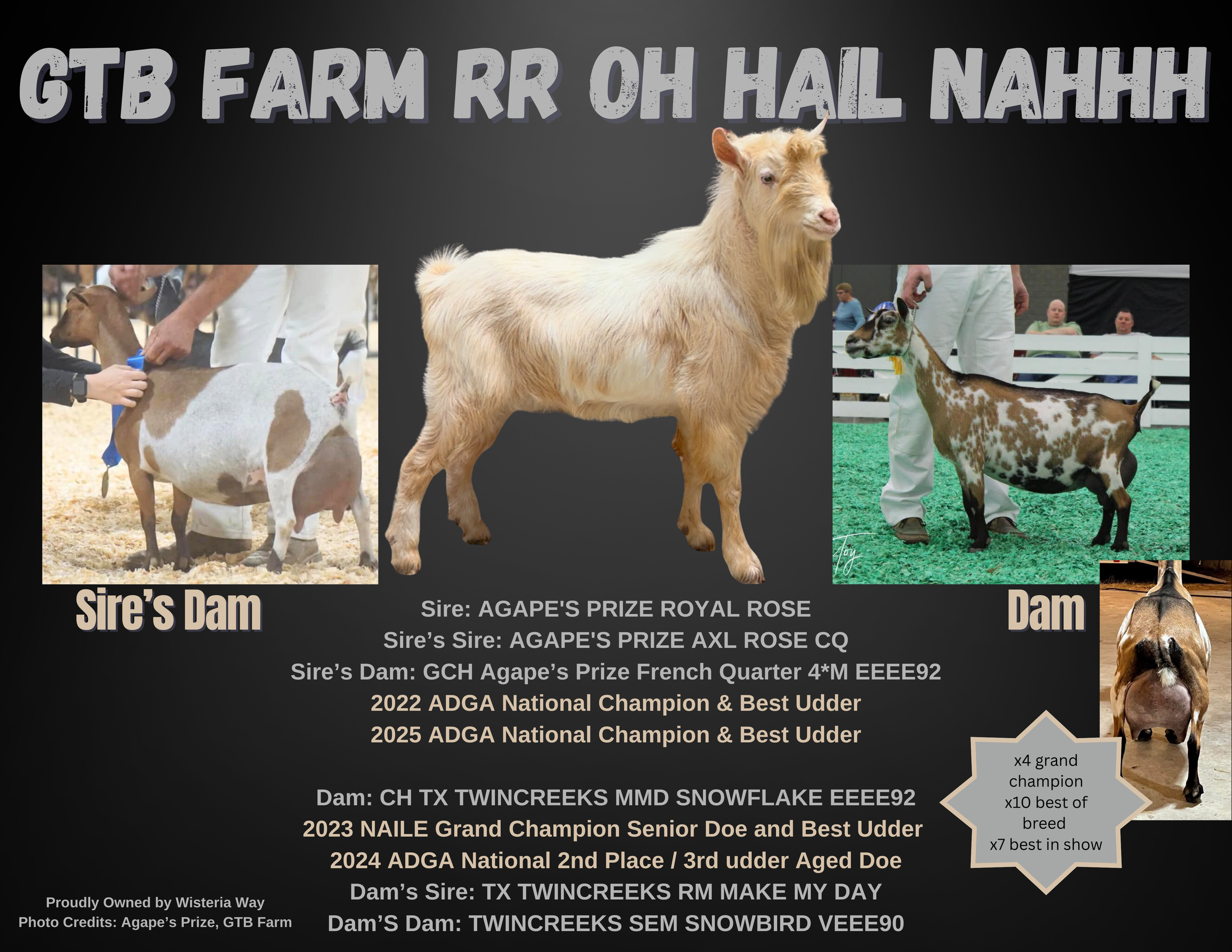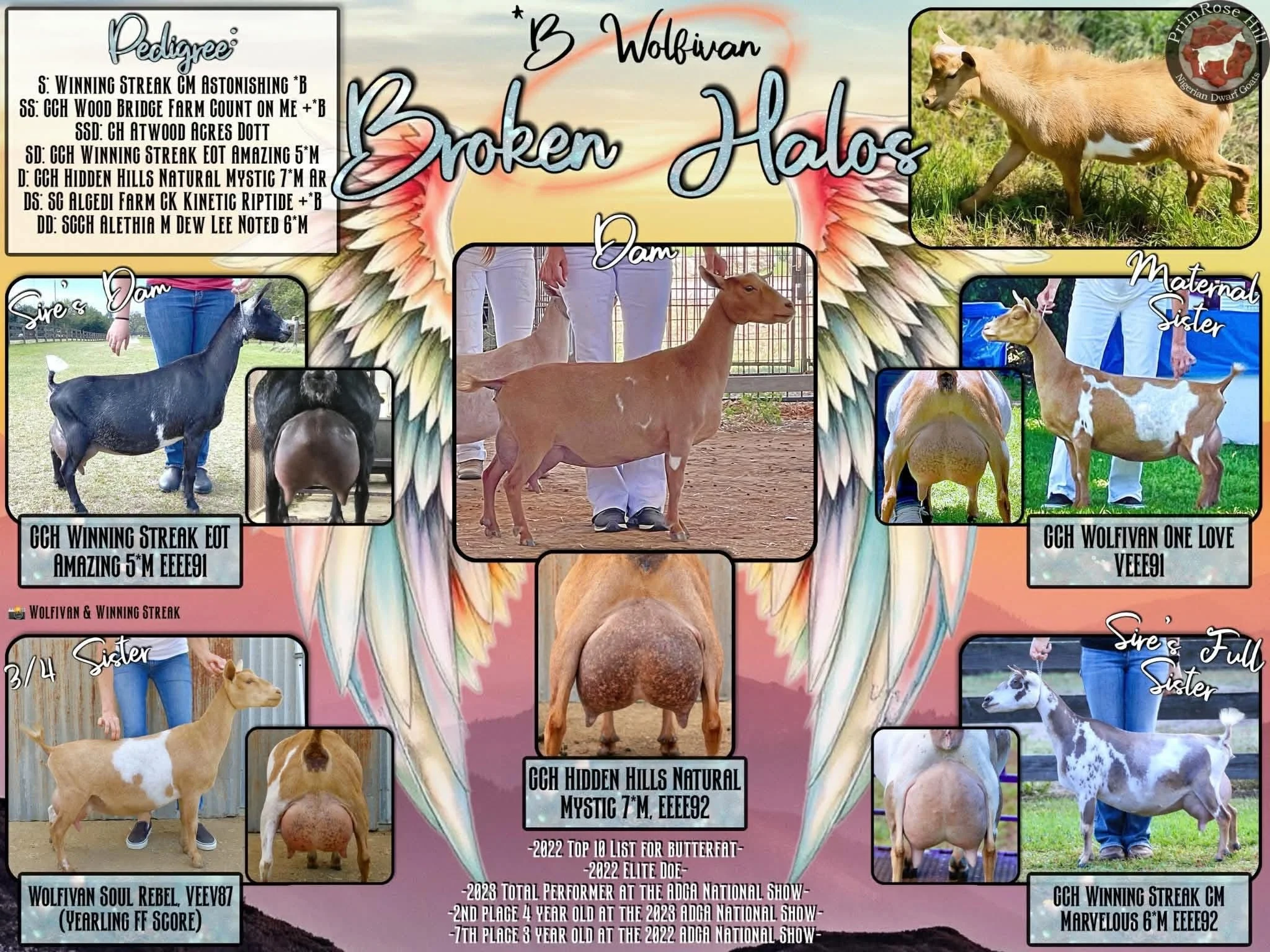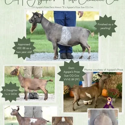 2022 Top 10 List for butterfat, 2022 Elite Doe, 2023 Total Performer ADGA National Show, 2nd place 4 year old 2023 ADGA National Show, 7th place 3 year old 2022 ADGA National Show. Yearling milker daughter 1st place 2024 ADGA Nationals -
