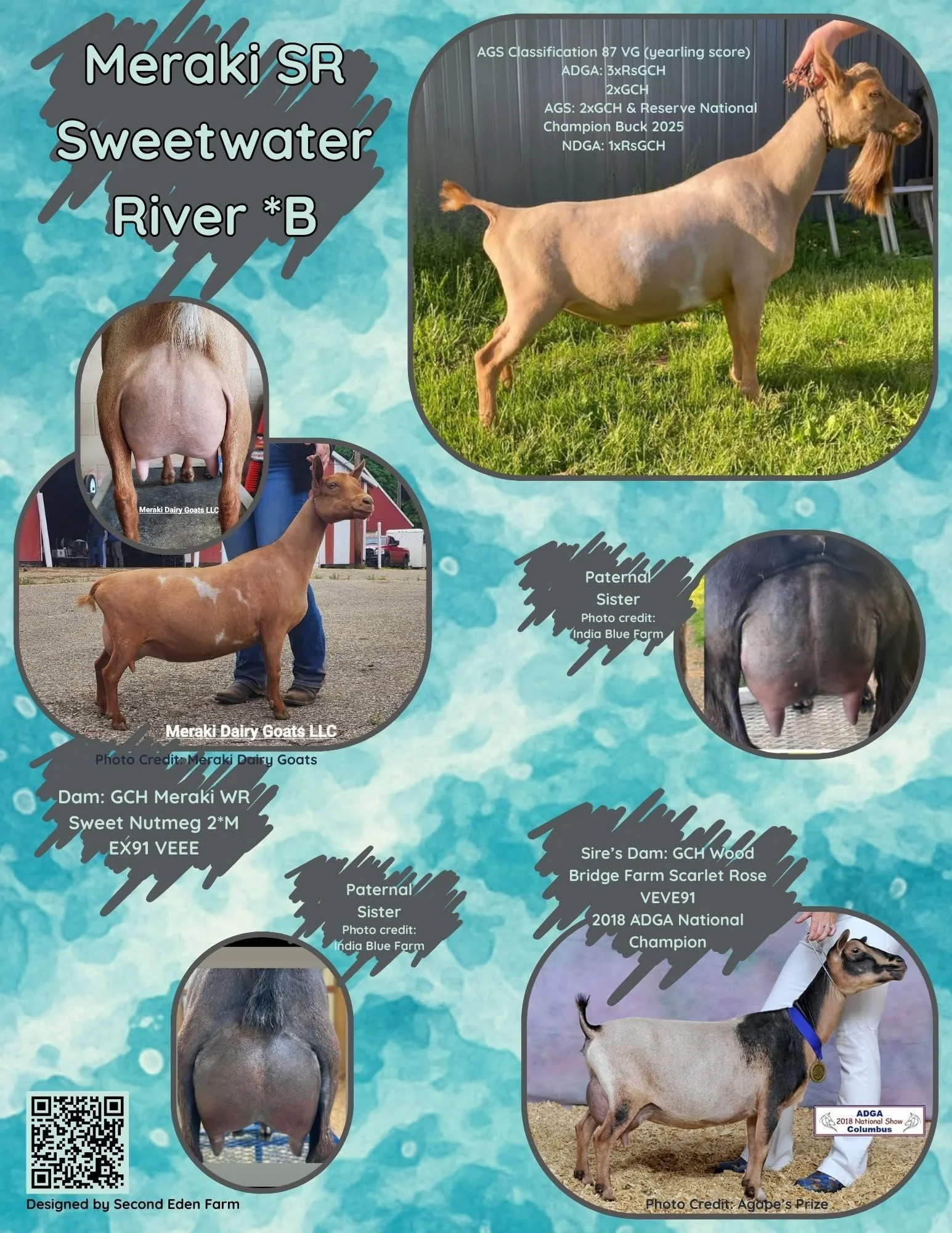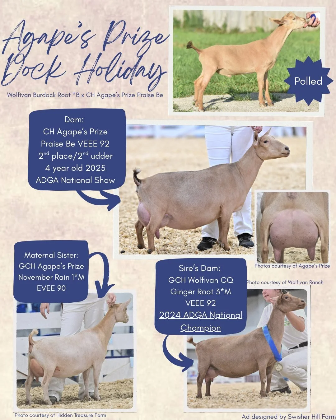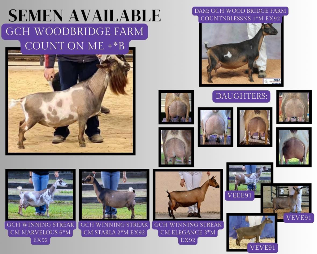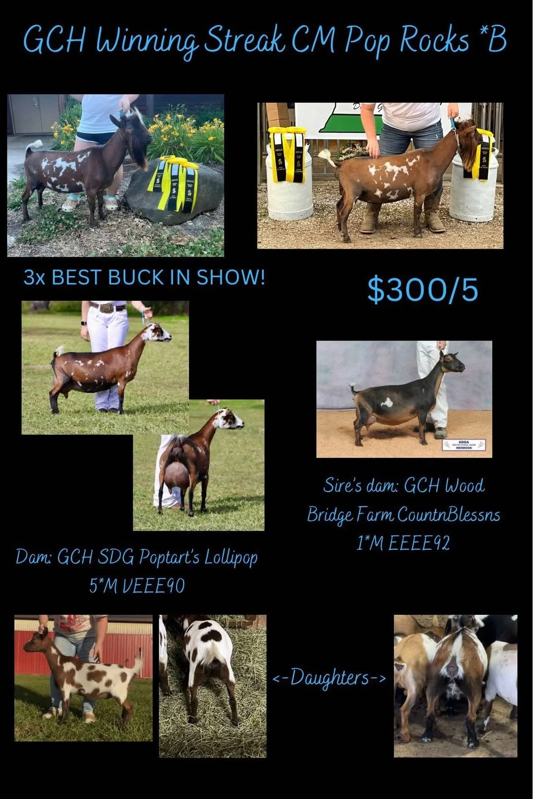 2022 Top 10 List for butterfat, 2022 Elite Doe, 2023 Total Performer ADGA National Show, 2nd place 4 year old 2023 ADGA National Show, 7th place 3 year old 2022 ADGA National Show. Yearling milker daughter 1st place 2024 ADGA Nationals -