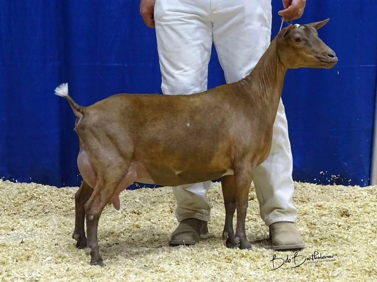 Nala’s Sire, Agape’s Prize Aint’ that lovin (“Butters”), is a son of Dam- CH Agape's Prize Priscilla Presle: 2023 ADGA Nationals 2nd place/1st udder 2 year old milker; 2024 ADGA Nationals 3rd place/1st udder 3 year old milker; EEEE 92 (2F). And his Sire is: CH Agape’s Prize Peris Mason *B.
